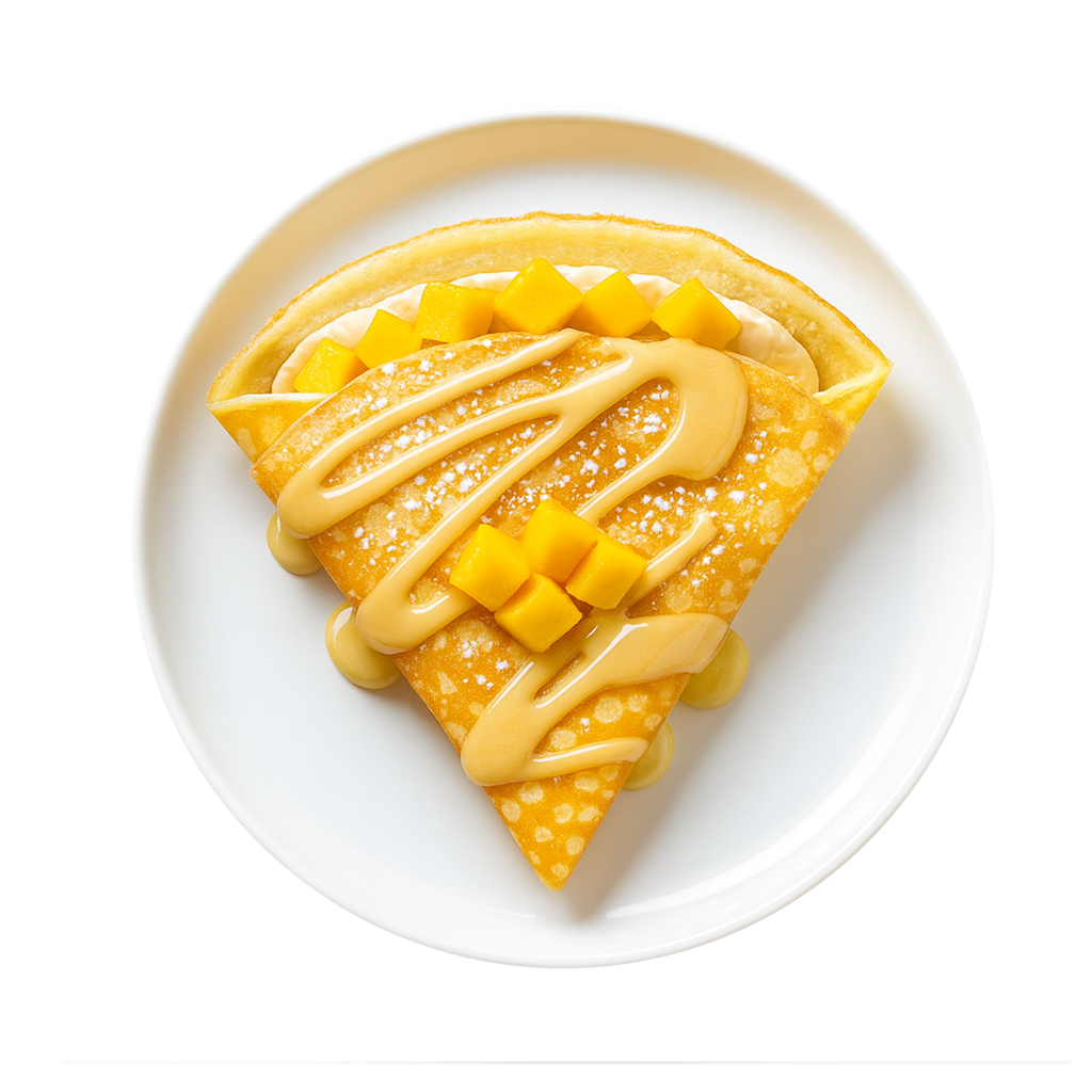 aluat alb*, crema vanilie cu mascarpone*, cuburi Mango, topping vanilie