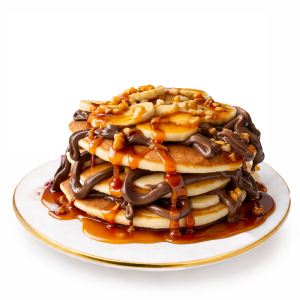 Pancakes*, ciocolată albă, mango, zmeură, topping vanilie și zmeură